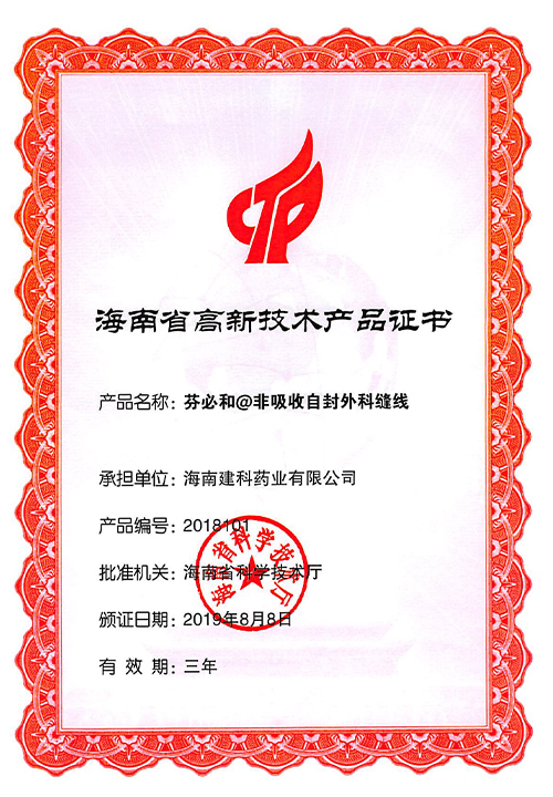 海南百迈科(原海南建科)的“封创翎”可吸收性外科缝线,是国内取得注册证并拥有完整自主知识产权的可吸收免打结缝线,填补了国内空白。公司生产基地、研发中心坐落于海南省生态药业示范园即定安塔岭工业园区内,4000m的十万级净化车间和600m的万级无菌实验室,拥有全自动切线机、裁线机、夹针机、冻干机、环氧乙烷灭菌器等100余台自动化数控生产设备,配套高效液相色谱仪、紫外分光光度计、傅里叶红外光谱仪、气相色谱仪等50余台大型常用检测检验设备。